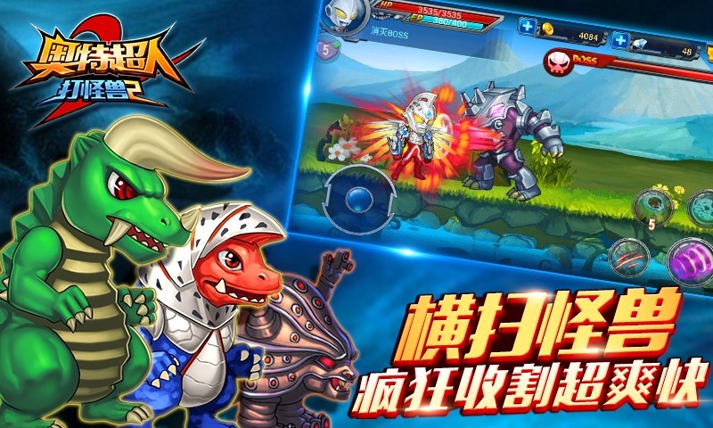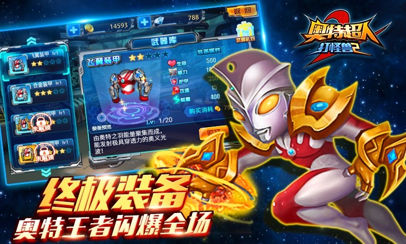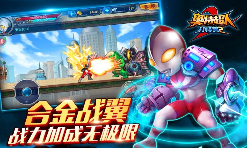 【合金装备,量身打造】 游戏新特色,为奥特曼量身打造全新装备,装备升级让你战力飙升!飞翼装甲超快射速,飓风装甲散射收割,更强的打击感,更多的怪兽,更痛快的扫射,感受奥特曼的力量!一起战斗吧! ![]() 【横扫快感,收割快感】 游戏画面精美细腻,高度还原奥特曼角色,热血激昂的激光大招,炫酷碉堡的技能带领玩家感受激战体验。激光射击收割怪兽,激战BOSS通关到底。还有更多武器和更多挑战性关卡让你停不下来! ![]()