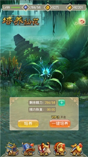 仙花 可以利用精力对仙花进行培养,可以获得大量的金钱和经验,并且还有机会获得道具。在VIP2时还会开启一键培养模式,方便操作的同时更节省了玩家的时间。