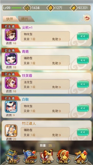 伙伴 当你需要调整阵容时,不用一一点开查看,可以在主页中点击伙伴,此处明确展示你所拥有的所有角色卡片,让你对你他们的颜色、资质、攻击属性、天命等级等了若指掌。