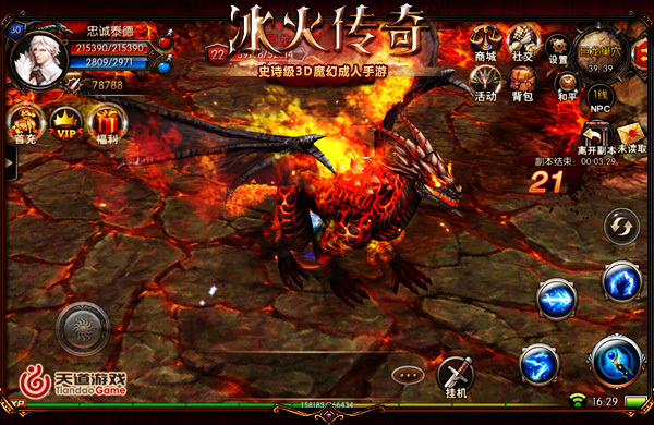 《冰火传奇》 《冰火传奇》手游采用Unity3D引擎打造精美的全息感光影画面,华美精致的建筑,酷炫的技能特效,让你享受一场前所未有的视觉盛宴。独创徽记系统,收集搭配激发战力潜能。拉风魔龙坐骑,免CD挂机,全自由PVP,配合满屏酷炫技能特效,带给你绝地厮杀的酣畅体验。