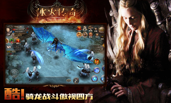 《冰火传奇》骑龙战斗 傲视四方 骑龙战斗傲视四方 异鬼威胁迫在眉睫,玩家在《冰火传奇》尽可享受驯化战龙,驾驭迎战的霸气快感!超越美剧发展的龙与异鬼巅峰战一触即发,重要的是你可以亲身体验痛快杀戮!不仅如此,《冰火传奇》将龙的玩法演绎极致,孵化龙蛋,探险龙巢,魔龙坐骑全方位玩法贯穿游戏始末,你的专属战龙只等你来驯养,制霸大陆!