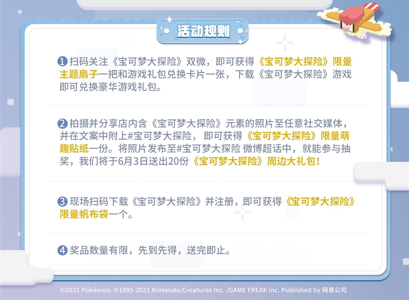在联动主题店里,除了可以享用必胜客的各类美食外,还可以参与《宝可梦大探险》精心筹备的互动活动,丰富多彩的周边等你领取。现场关注《宝可梦大探险》双微即可获得限量版主题扇子一把和游戏礼包兑换卡一张,兑换卡可在游戏内兑换内含丰富奖励的礼包一份;现场扫码下载游戏并注册,便可获得限量帆布袋一个;拍摄店内含有《宝可梦大探险》元素的照片分享至社交媒体,并按格式发布文案,就能赢取限量萌趣贴纸一份,将照片发布至#宝可梦大探险 微博超话,则可参与抽奖,有机会获得周边大礼包一个!