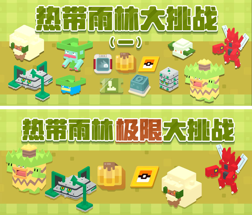 同时,探险家们还将迎来“热带雨林大挑战”与“热带雨林极限大挑战”,与各种野生宝可梦展开对抗,获胜后可以获得珍贵的食材芭亚蕉、招式学习器·陀螺球、兑换券、友好商店礼券、锵锵松糕等丰富奖励。宝可梦的属性、招式差异既是挑战也是乐趣,请尽情在实战中提升你的小队实力吧。