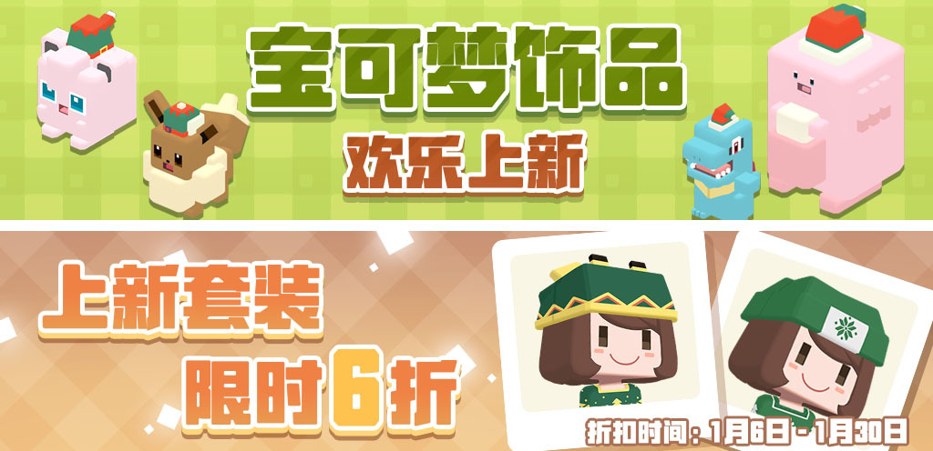 随着元旦版本的开放,《宝可梦大探险》还上架了一批崭新装饰与服装,为探险家们提供最个性最出彩的元旦时尚指南。快来用新饰品装点你的个性营地,让新套装为你注入满满的元气能量吧!