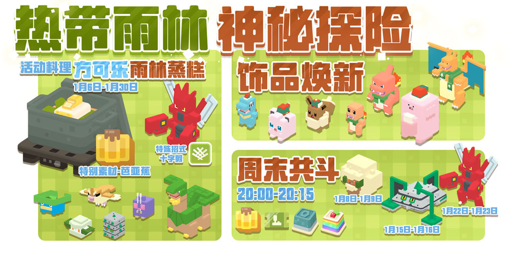 元旦版本惊喜降落,全新探索热带雨林!由网易、The Pokémon Company、GAME FREAK inc.携手开发的《宝可梦大探险》元旦版本全新活动火热进行中,风情特异的自然风光,不同的雨林生物,创意与美味兼具的特色食谱,海量内容放送中,诚邀各位探险家一起探险!