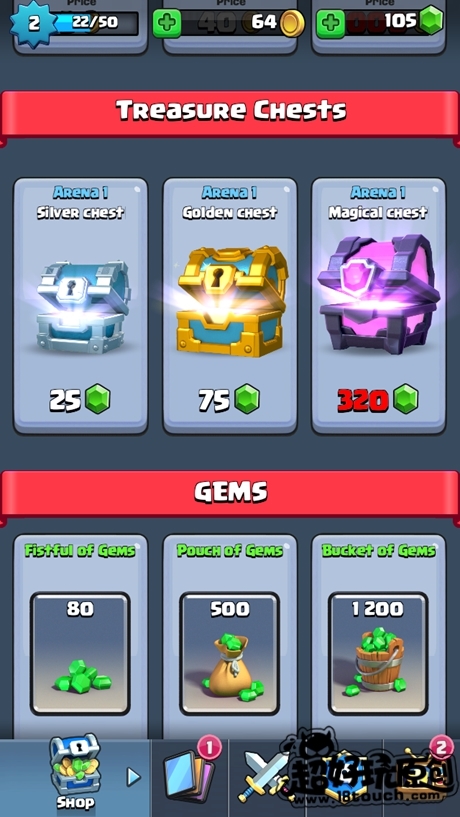 铜箱:得到3张兵种卡牌和金币,开启时间需要15秒; 银箱:得到4张兵种卡牌和金币,开启时间需要3小时,需要25绿宝石购买; 金箱:得到14张兵种卡牌和金币,其中至少有1张橙卡,开启时间8小时,需要75绿宝石购买; 神秘宝箱(紫箱):得到48张兵种卡牌和金币,其中至少有8张橙卡,1张紫卡,开启时间12小时,需要320宝石购买。 宝箱获得方法二:战斗胜利 进入战斗需要消耗1金币,匹配战斗胜利的话系统会根据玩家的战迹和对手的水平赠送不同品质的箱子。