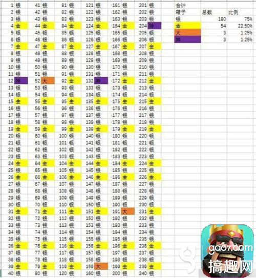 皇室战争皇冠宝箱怎么刷?皇室战争卡牌与宝箱有什么关系?接下来为大家介绍皇室战争刷皇冠宝箱攻略以及卡牌与宝箱数据分析。 作为一个卡牌游戏,最重要的的就是卡牌产出了。越好的箱子能开出越好的卡牌,橙色卡牌的产出箱子如何刷呢?请大家往下看! 卡牌与箱子关系 这是一个卡牌游戏,现阶段有四种卡:普通(白卡),稀有(橙卡),史诗(紫卡),以及传说(放心你开不出来)。可获得宝箱分为白银箱子,黄金箱子,紫箱子和新出的巨人箱子,大紫箱子。以及每四小时可以获得的一个木头箱子,一天刷新一次的皇冠箱子(条件是必须获得10个皇冠才可以打开)。每人都有四个宝箱栏位,满了后就不会得到新的箱子(要是能扔掉不想要的箱子,人人都去刷紫箱子,这游戏也就废了)。不过早已有神豪科普,这个游戏的得箱子的顺序是固定的,箱子满了不会影响得箱子的顺序,所以萌新们不用担心,因为箱子满了可能错过本来能有的紫箱子巨人箱子。 附上:新版宝箱顺序图