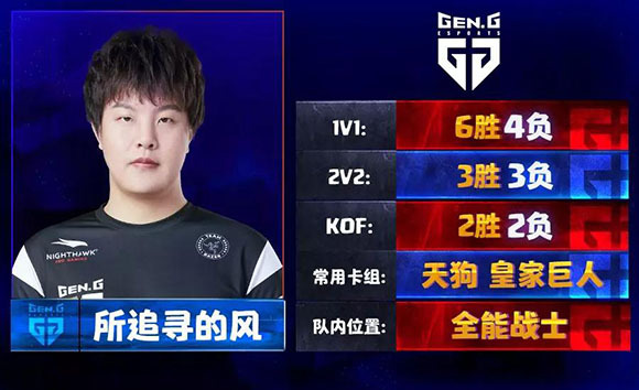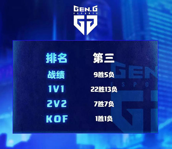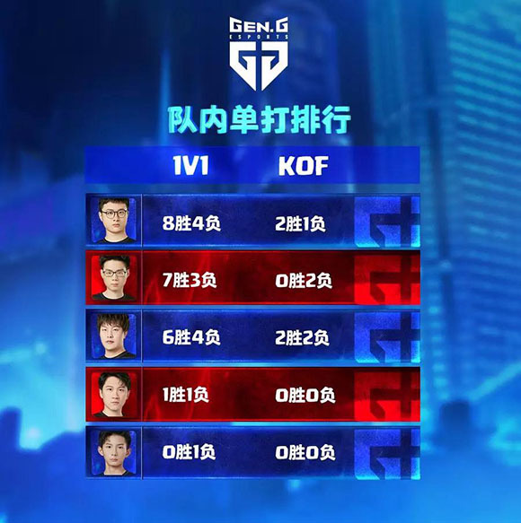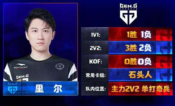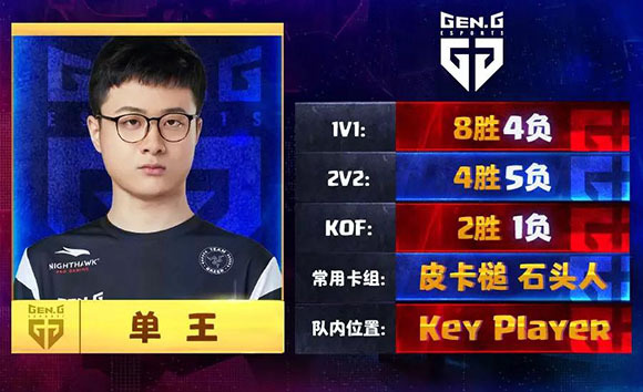 在招牌单打的反衬下,GEN.G胜率一半的2V2有点不够看,在季后赛四强中也是排名垫底,常规赛对阵Nova、W.EDGM、LGD双打更是未尝一胜,季后赛这一分着实不好拿。而在上赛季单王三次KOF一穿三的表演后,GEN.G本赛季只打了两次KOF,要么1V1打疯了3-0或3-1带走,要么单打不灵1-3或0-3输掉,成也单打、败也单打成为GEN.G本赛季的缩影。 队员巡礼