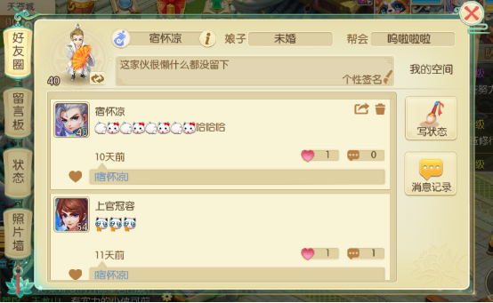 五湖四海皆兄弟,玩游戏最重要的一个环节就是交朋友了! 游戏支持通过角色名搜索在线玩家,打开好友列表,点击添加就可以输入角色名进行搜索,不记得准确的角色名也没关系,输入名字中的一个字也可以搜索的。此外还可以添加系统推荐的同一个城市或者同一个帮会的玩家为好友! ![]() 聊天 游戏内设置有各个聊天频道,玩家可自由选择在各个频道聊天吹水,在同城频道还可以发现和自己同省份的玩家。 空间 游戏内设置有空间系统,玩家可在空间内发表签名、状态,还可以在其他玩家的空间进行点赞、评价、留言、送礼等互动。空间设置有照片墙,热度达到一定数量的状态图片会出现在照片墙,可在此查看全服热门状态并进行互动。 ![]() 变身 每周五的五毒入侵活动中有机会掉落变化之术,使用变化之术可将场景内其他玩家随机变成其他萌萌哒形象。 ![]() 组队玩法 游戏内设置有各种组队玩法,除魔、逸闻录、影界平乱、十八罗汉、帮会入侵等等,没事拉小伙伴组个队做个任务交流下感情也是极好的。 |
