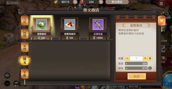 侠义值可在侠义商店中兑换宠物食材、资质洗炼丹以及龙渊宝鉴等道具。特别注意:侠义商店是设置在积分商店之内的哦!