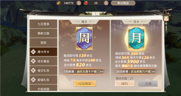 【购买月卡 获得额外次数】 虽然每一个英雄副本的掷骰子次数有限制,但是玩家可以通过购买月卡获得额外的掷骰子次数。玩家点击福利按钮,进入界面后即可看到月卡购买界面。购买月卡成功后,玩家将获得赤玉奖励和每天增加一次副本掉落掷骰子次数。