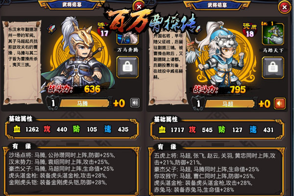 三国乱世人才辈出,有时候往往一个家族中就会出现众多英雄人物,曹氏父子诗书世家、孙氏父子文武双全,诸葛父子为国尽忠。夏天正是父子郊游的好时节,在《百万曹操传》中,当这群英雄父子一起上阵时,会是怎样的景象呢? 父子双雄 睥睨天下 作为《百万曹操传》的绝对主角,提起父子英雄自然少不了曹操一家。曹操是一代枭雄,他的儿子曹丕也是一个能文能武的君主。他们权倾天下,坐拥半壁江山,可谓是三国时期最成功的父子。因此在游戏中,他们的技能也异常霸气。曹操的号令天下,曹丕的沙场修罗,尽显一代雄主睥睨天下的傲气和实力。 ![]() 图1【百万曹操出击】 各有所长 独霸一方 如果说曹氏父子属于全能型人才,那么江东的孙氏父子则各有所长,专项突出。孙坚、孙策披坚持锐开创江东基业武力过人,而孙权则是一个守成之君,强于内政,任用人才,最终割据一方。在游戏中,孙氏父子的技能也有着鲜明的特色,能攻善守,各司其职,一齐上阵可以让阵容搭配更平衡、更合理。 ![]() 图2【江东基业】 西凉铁骑 一马平川 刘备围困成都一年,久攻不下,西凉马超率兵入蜀一举平定四川,留下一马平川的美名。在三国中,西凉铁骑的威力从来都会让天下人战栗不已。董卓吕布父子从西凉入京,搅乱天下,才形成了三国乱世,而马超马腾父子同样也是三国中一方诸侯,位居西凉的他们兵锋直指,强如曹操都被吓得割须弃袍,仓皇逃命。在游戏中,西凉的英雄也具有一往无前的特点,技能伤害惊人。 ![]() 图3【西凉猛将】 三国的大战持续了100年,三国的故事流传了上千年,现在三国经典故事将在你的手中重演,《百万曹操传》期待你的到来。 |
