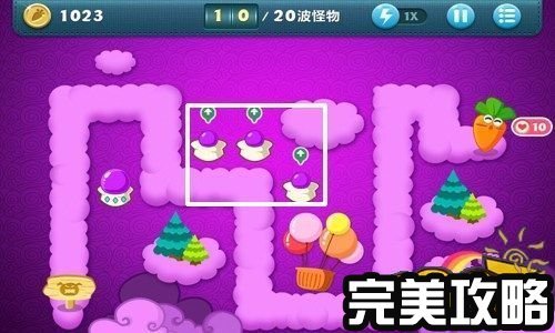 保卫萝卜天际4攻略截图 4个炮塔在保卫萝卜的过程中,消灭了第10波怪,金钱累积到了1023,然后玩家把白色方框内的3个魔法球炮塔升为中等级别(如上图所示)。
