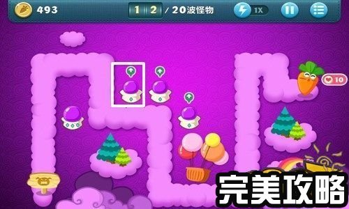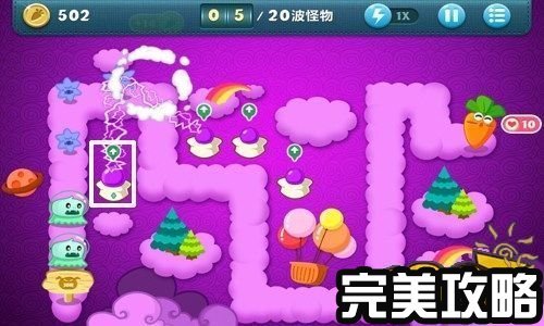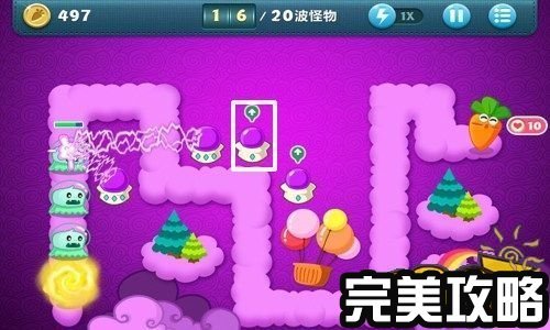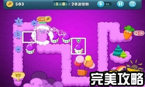 保卫萝卜天际4攻略截图 消灭了第18波怪,金钱累积到了503,把最后一个魔法球炮塔升为顶级,然后在另外一个白色方框内建造便便炮塔(如上图白色方框所示)。