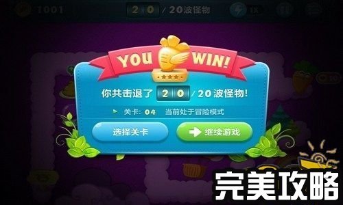 保卫萝卜天际4攻略截图 4个顶级魔法球炮塔和1个普通便便炮塔成功的消灭了第20波怪,保卫萝卜不被怪物侵犯(如上图所示)。