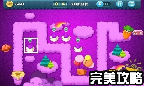 保卫萝卜天际4攻略截图 通过消灭怪物把金钱累积到了640,然后把白色方框内的魔法球升为中等炮塔(如上图所示)。