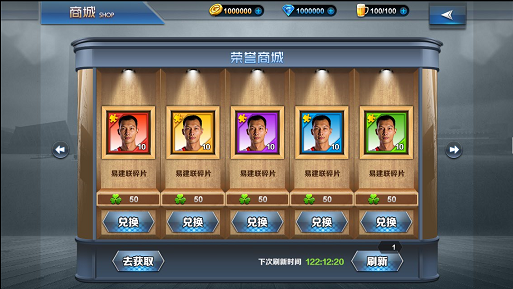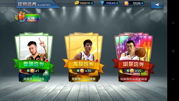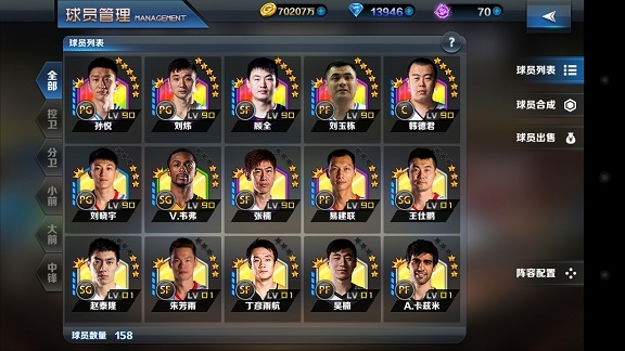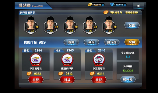 1、5张卡牌从左到右按照控球后卫,得分后卫,小前锋,大前锋,中锋的位置排列。 2、卡牌上显示球员的姓名,星级,评分,等级,在球场上的位置。 球员系统