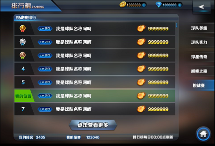 玩家可以通过点击“排行榜”按钮查看挑战赛的排名,每天22点(暂定)系统会根据排行榜中玩家的排名为玩家发放每日排名奖励。发放奖励的时间持续半个小时(暂定),即22:00~22:30,在这个时间内,所有玩家都不能进行挑战。