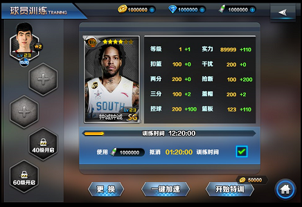 此界面显示了三种选拔方式和: 1、普通选拔:玩家花费10000金币获得一张卡牌。有几率获得最高二星卡牌(每隔一段时间,玩家可以获得一次免费抽取的机会) 2、高级选拔:玩家花费288钻石可以抽取一张卡牌,有几率获得最高三星卡牌。(每隔一段时间,玩家可以获得一次免费抽取的机会) 3、明星选拔:一定获得明星球员,并且极高几率获得热点球员 养成系统 点击主界面的“养成”按钮可以进入球员养成界面,玩家可以在此对球员卡牌进行升级和进阶来提升整支球队的实力。 球员训练 1、通过点击界面左边的“+”栏或者界面中间卡牌框内来选取待升级的球员。 2、球员升级的方式是通过利用金币并花费一定的时间来进行的,金币和时间的消耗都会随球员等级的提升而增加。 3、点击【开始升级】按钮以后,【开始升级】按钮会替换为【加速升级】按钮,【加速升级】按钮的右上角会显示加速需要消耗的钻石数额,加速升级可以有效地节约升级要耗费的时间。 4、加速升级需要花费钻石或者加速卡,每一张加速卡可代替5min的训练时间,加速卡可以通过赛事系统和游戏中的活动来获得。 5、球员的等级不能超过球队的等级。