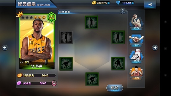 1、点击“球队阵容”界面的卡牌本身,进入“球员信息”界面,显示球员相关信息。 2、点击“球员属性”、“球员羁绊”、“球员天赋”栏展开可以查看具体的信息。 3、可以查看每一位球员所拥有的装备。 4、玩家可以通过此界面的按钮进入球员养成系统。 5、通过对卡牌的左右滑动可以切换球员查看信息。 6、点击主界面的点击“球员”按钮,可以进入球员列表。 7、玩家可以查看和管理自己所拥有的全部球员卡牌或者碎片,并对他们进行出售、分解。分解球员卡牌获得的道具“篮球之魂”,可以在黑市系统中兑换物品。 8、玩家可以收集球员卡牌碎片,当收集一定数目后,可以合成球员卡。 选拔系统 点击主界面的“选拔”按钮,进入到球员选拔系统,玩家可以通过各种选拔方式来获取自己想要的球员。