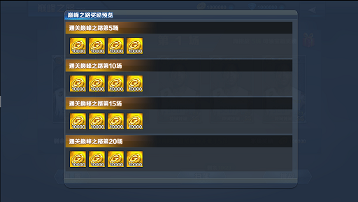 巅峰之路在玩家15级的时候开启,挑战成功后每场比赛都可获得一定的金钱。每挑战至第五场时,即可获得宝箱奖励,奖励直接发放到玩家背包。线性挑战,直到挑战到最后一场比赛或者失败次数用完,每天有3次失败机会,挑战失败,则失败次数减一,3次后将不可继续挑战。 点击“宝箱预览”按钮可以查看通关奖励。