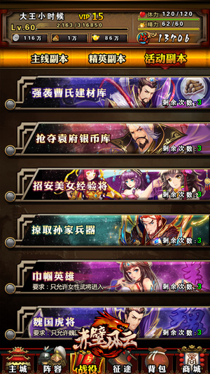 袁府四世三公,朱门豪苑,家里都富的能开中石化了啊。玩家纵横沙场,总有囊中羞涩的时候,正是时候受命于天,劫富济贫来匡扶大道啦。三十六计之趁火打劫指的便是乘人之危谋取私利。趁火打劫之计的使用,在中国历史上层出不穷。趁火打劫之计的特点,就是利用时机,果断地打击对方。 袁绍在官渡之战大败于曹操之后,袁府声势一落千丈,在袁绍病逝之后,袁府人心惶惶,颇有些树倒猢狲散之感。玩家在此时征讨袁府,时也运也,顺手牵羊地为自己捞上点油水,好像……并没有什么错,(⊙v⊙)嗯。 除了“抢夺袁府”以外,手游《赤壁风云》中的系列活动副本,还有曹氏、孙家等多个资源抢夺副本,这些在群雄割据时期占据大批资源的土豪,就是玩家的生财之道啦!
