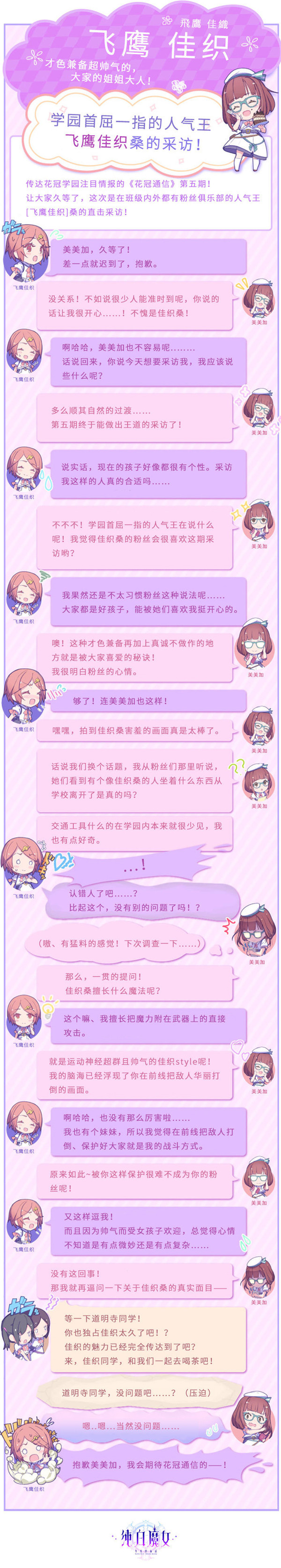 大家好!在你们快把它忘掉的时候, 花冠通信又出现了。 本期《花冠通信》的受访嘉宾是才色兼备、温柔善良、强大帅气、最受欢迎的学园人气王——飞鹰佳织桑。 ㄟ(≧◇≦)ㄏ 别拦我我还能继续吹佳织(你冷静一点.jpg) 大家快来感受佳织的魅力吧! ↓↓↓