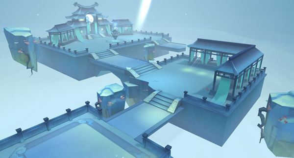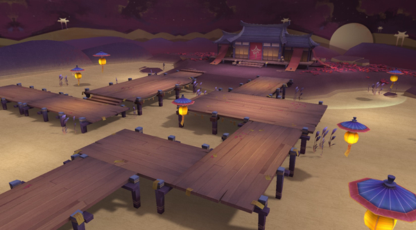 演武堂 角落里晶莹剔透的莲灯和丹顶鹤都烘托了场景中仙气缥缈、清灵奇幻的氛围;若伞状的彼岸花、黄泉路上漂浮的纸灯笼似乎也在昭示着这些是凡人所不可企及的地方。