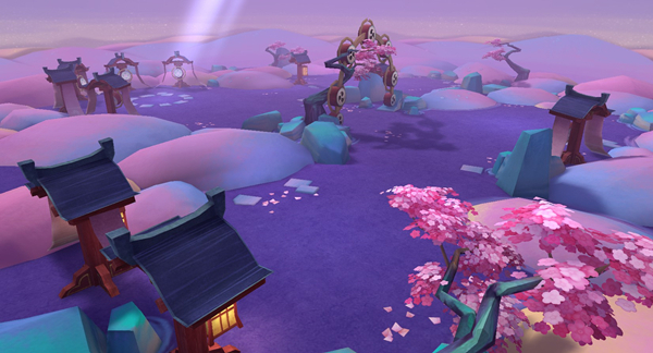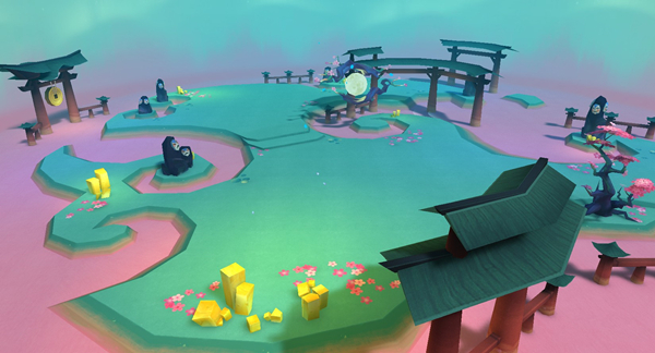 巨象花海 【和风X国风:神秘雅致的东方建筑】 游戏中的建筑物充满了浓浓的东方风情。日式鸟居就像通往神界的结界,悄然树立在樱花树旁。细观,假山表面竟刻有哀乐不明的表情面具,引而不发、幽玄寂感油然而起。