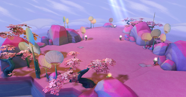黄泉幽境 游戏中对东方符号的运用并不拘泥于传统含义。云麓仙居沿路展开的彩色折扇、像树木般屹立一旁的粉色团扇在新的组合形式下拥有了全新的意义,如同置身梦境一般迷醉而浪漫。