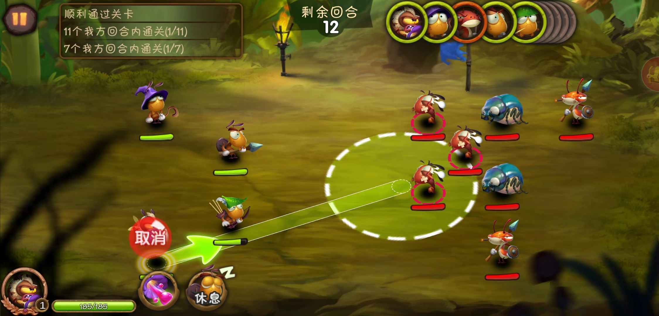 二、爽快的弹射回合 重点来了,这次核心要说的就是《虫虫物语》的玩法了,哪怕对于玩遍了回合手游的小编而言,这样的操作也是非常新颖的。 因为对于常规的回合制游戏而言,基本都是点点鼠标或点点手指,然后轮流互相攻击的老套流程,对于玩惯了吃鸡或者王者的电竞玩家而言,不仅有些单调乏味,而且节奏也是慢悠悠的不够爽。