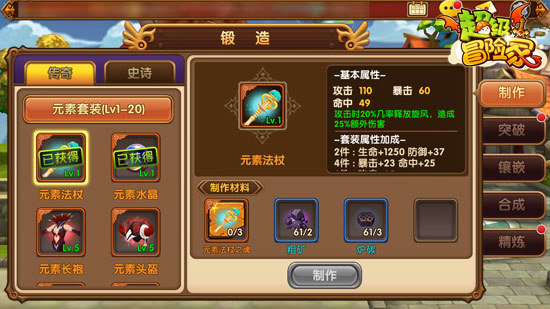 《超级冒险家》第三次删档测试已经正式开启,此次测试游戏开放了全新的装备锻造系统,为广大玩家打造最炫酷的装备,让大家拥有无与伦比的实力。 装备制作 在游戏中,除了副本掉落、任务奖励等方式可获得装备以外,玩家还能够自己收集材料制作装备。制作的装备分为传奇和史诗两类套装,传奇套装包括主武器、副武器、头盔、上衣、裤子、鞋子、项链、戒指8件,史诗套装则只包括主手武器、副手武器、项链、戒指。玩家可以通过各类副本来获得装备制作的材料,打造自己的极品神装。