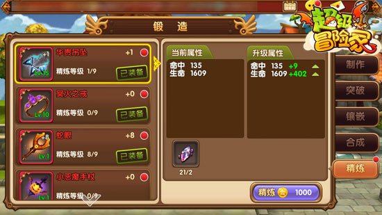 宝石镶嵌 随着玩家的升级,玩家可以为装备位镶嵌各属性的宝石,以增加装备的属性。每个装备位拥有5个钻石孔,包括已开启的钻石孔和未开启的钻石孔,玩家可以使用打孔石来打开未开启的孔。每种属性的宝石每个装备位上只能镶嵌1颗;玩家更换装备,与装备位上镶嵌的宝石无关,宝石只存在于装备位之上。 宝石合成 宝石是可以合成来升级的,每3颗同样等级同样属性的宝石可合成为1颗更高等级的宝石。合成后的宝石属性将成几何倍数增长,各位朋友记得多多合成哟! 装备精炼 玩家在20级时候可开启精炼。精炼属于锻造系统的一个功能,可以升级装备附加的属性。每件装备都有自己的精炼等级上限,玩家通过精炼石来对装备进行精炼,提升装备属性,为自己的冒险之旅增加强大战力。