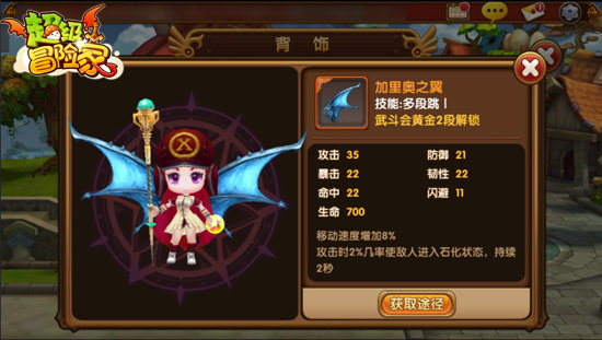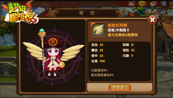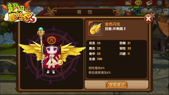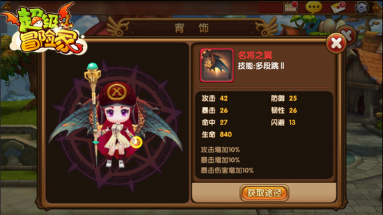 3D横版动作冒险手游《超级冒险家》为广大玩家打造了一个炫酷多彩的冒险世界,在这个世界里,你可以通过各种手段来丰富自己,打造酷炫形象、提升实力,成为冒险大陆一颗闪耀之星。 游戏推出了全新的背饰装备系统,玩家18级时即可开启。开启背饰后,玩家身后会多了一对耀目靓丽的翅膀,这对翅膀不仅能为大家带来一定的属性加成,还能在游戏3D场景的基础上,为大家带来跳跃上的突破,助你更轻松的玩转冒险世界。 【名将之翼】 颜色品质:红色 技能:多段跳Ⅱ 附加属性:攻击增加10%;暴击增加10%;暴击伤害增加10%