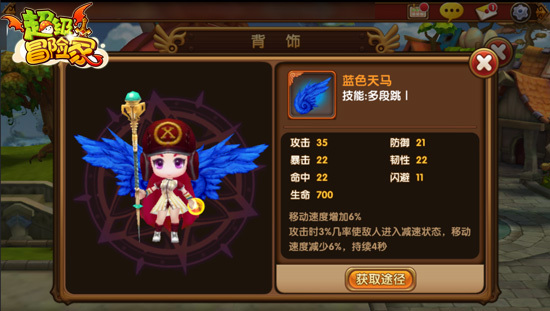 【蓝色天马】 颜色品质:橙色 技能:多段跳Ⅰ 附加属性:移动速度增加6%;攻击时3%几率使敌人进入减速状态,移动速度降低6%,持续4秒