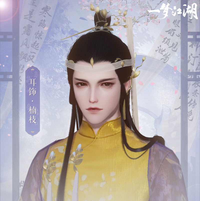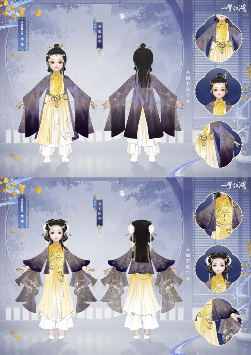 兰斛藏香,梅瓶浸玉。整套时装以景德镇瓷器为灵感,内衬黄白渐变,深紫外衫薄如蝉翼覆于其上,衣衫之间花纹若隐若现,影影绰绰宛若树荫。 成男少侠半束秀发,头戴金色玉兰花枝发簪。宽袖外袍之上装点着金色的玉兰枝叶,搭配腰间缀着玉兰花瓣的腰带,更显潇洒。女侠们的黄色内衬之上白梅朵朵,争相绽放,枝叶之间鸟雀跳跃,栩栩如生似有鸣啼隐隐传来。