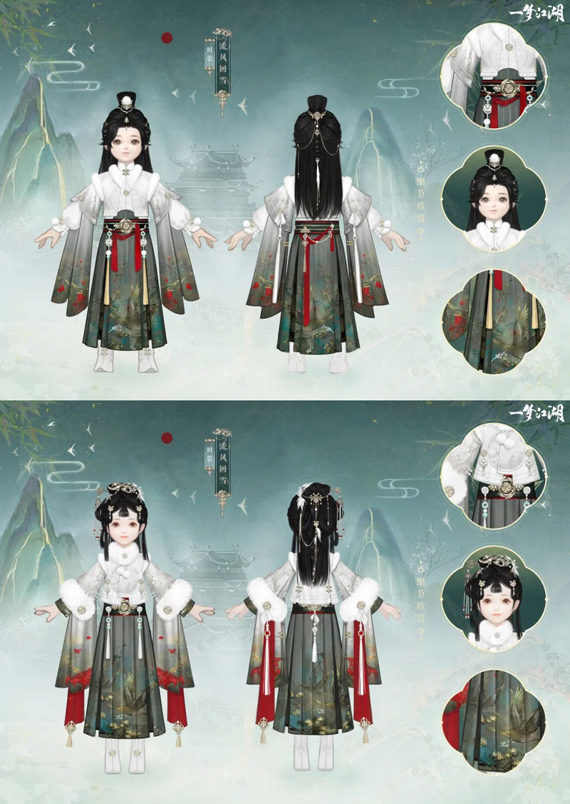 除了这套超凡脱俗、仙气飘飘的时装·流风回雪之外,祥冬至活动期间,云锦楼师傅也将少侠@李莹 在时装大赛中获奖的作品时装·浸玉藏香,带到了江湖之中。