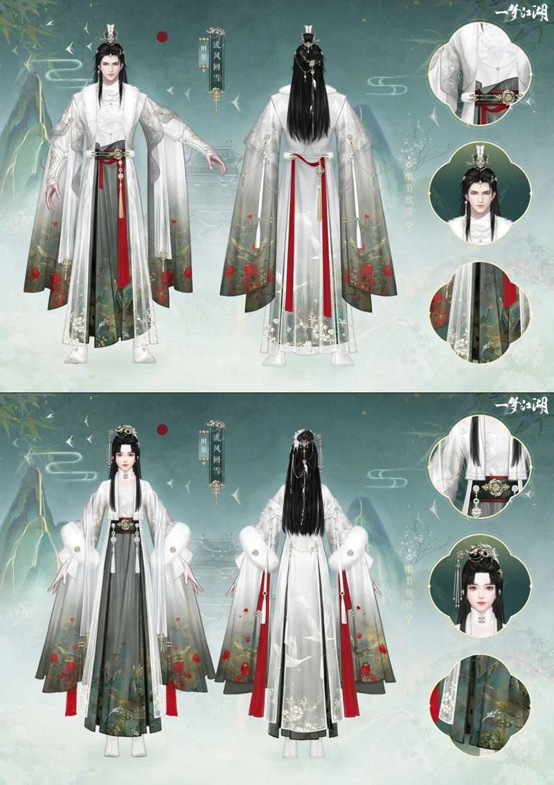 【时装·流风回雪】 髣髴兮若轻云之蔽月,飘飖兮若流风之回雪。整套时装素白如雪,红色丝带浓烈似火,渐变色裙摆层次感十足,鎏金线条更显精致尊贵。 少侠身着圆领内衬,领口金丝刺绣闪耀夺目,胸前仙鹤纹饰栩栩如生,似将高飞。襟前点缀的雪白皮草与毛绒腰带相照应,更显温暖华贵。女侠们头戴镶着珍珠、羽毛的流云步摇,戴金翠之首饰,缀明珠以耀躯。衣袖间以金丝刺绣勾勒出娇嫩的百合,搭配缀着珍珠的轻纱披帛,出尘脱俗,更显身姿轻盈。