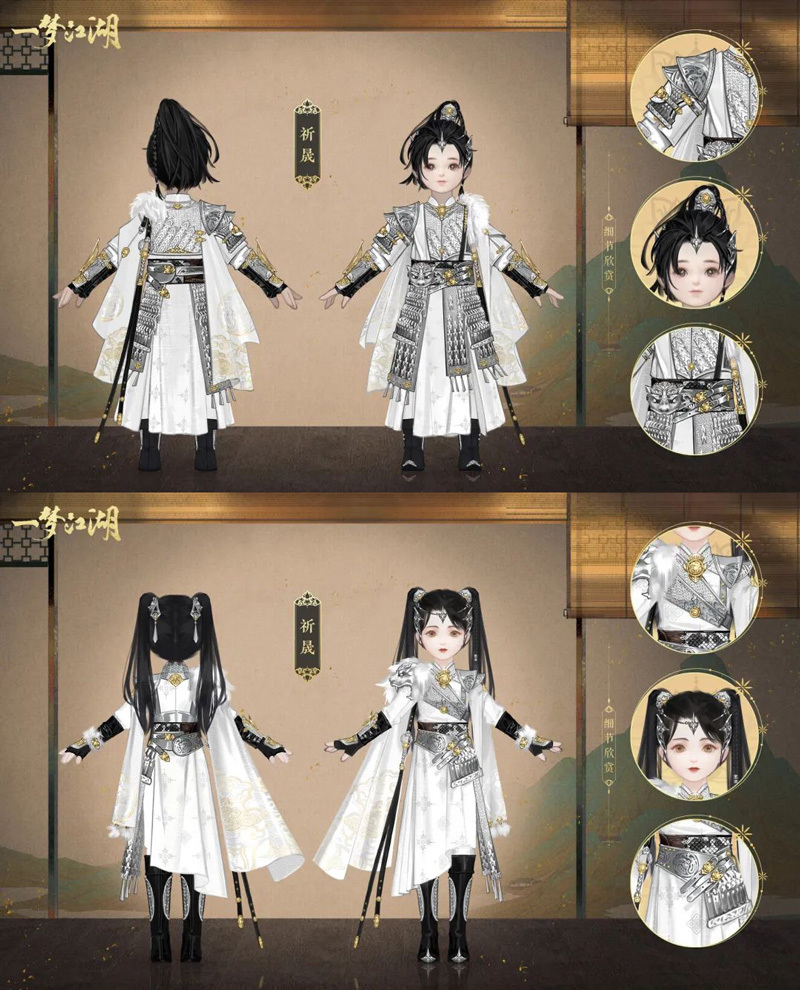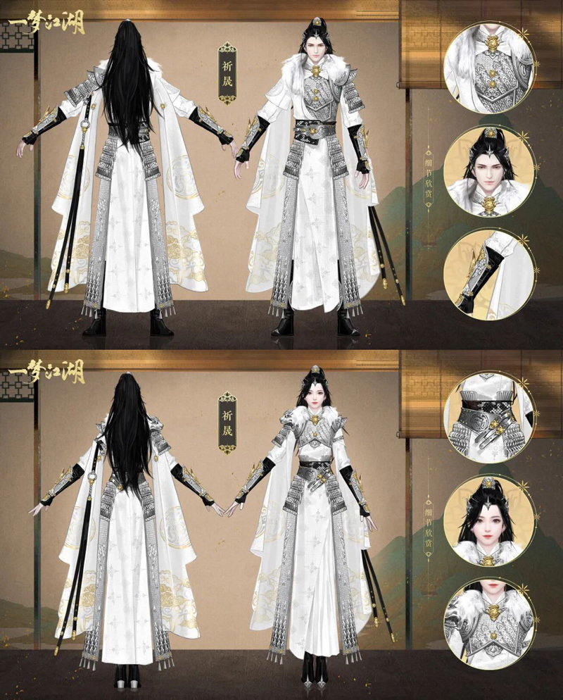 【金装·祈晟】 少侠们玉树临风,英姿勃发,极具设计感的两片袖摆从双肩对称落下,垂至脚踝,中央以金线细细勾勒出古玉兽纹,与银鳞甲上的镂空雕刻相呼应。袖摆处则绣着有祥瑞之意的祥云纹样,如此气宇轩昂的少年将军定能披荆斩棘,所向披靡。 女侠们身披软甲,又酷又飒,以奢华的银漆皮扣束腰,既利落又潇洒,在金色饰品的点缀下愈发光彩夺目。鳞甲搭配绣有暗纹的不规则裙摆,平整与褶皱糅合得恰到好处,别出心裁的设计给豪气的女将军增添了几分柔情。