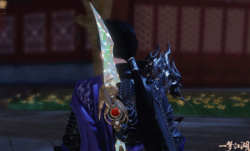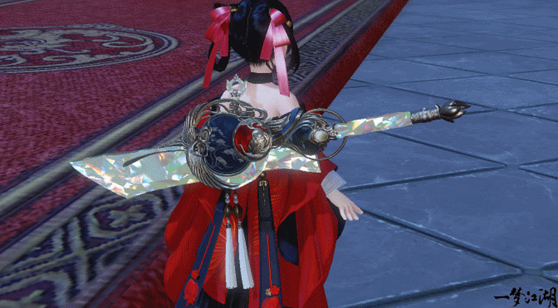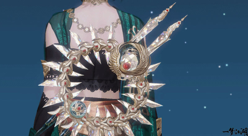 沧海弟子群星为引,长刀相随,流光溢彩的刀身灿若星斗,刀背上飞舞的仙鹤抱着一颗红宝石,与万华衍境·垣上的纹样相映成趣。