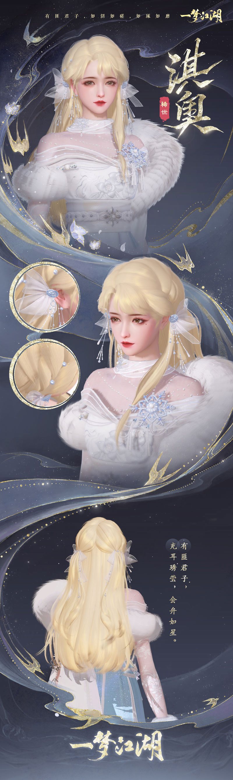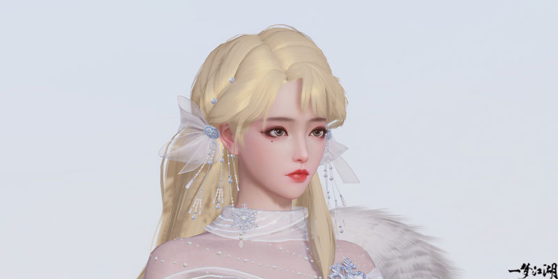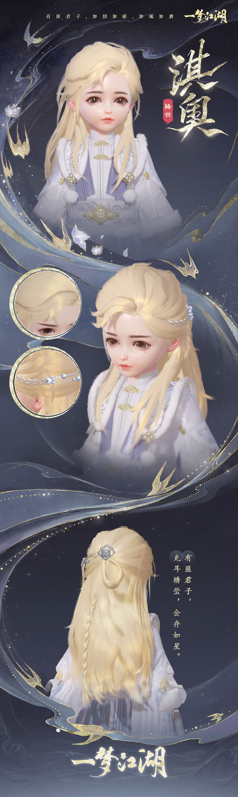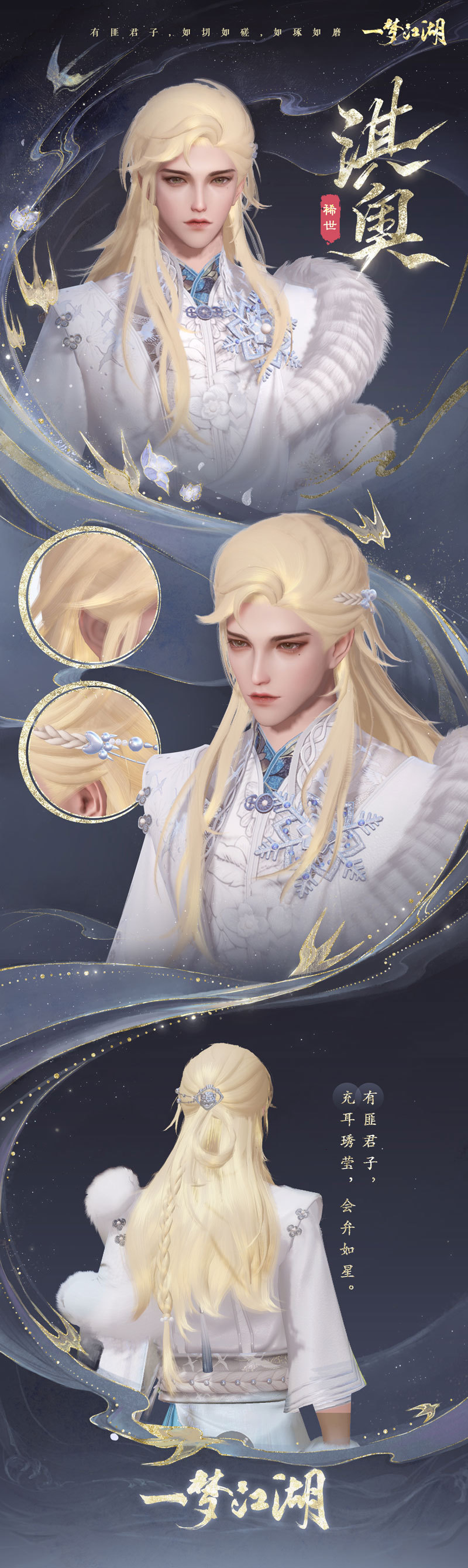 【稀世金发·淇奥】 云锦楼大师傅近日前往淇水之畔采风,见一人金发如瀑,又见冬日细碎的阳光照在水面上,泛起金色的粼粼波光。他忽有所感,于是跋涉山水,风餐露宿月余,终于在隐秘山谷中觅得一株特殊植物。由雪山融水日日浇灌,生于空谷而不腐,通体金黄,幽香阵阵,花叶柔软,隐隐泛着金光。 大师傅小心采摘,将其浸入泉水,烈火烧炙七七四十九日,再加入多种草药,制成了一款特殊染料,用这款纯天然染料染出的发型色泽华丽,发丝柔软。大师傅结合采风之地的风土人情,将这款稀有的华丽金发取名为“淇奥”,希冀拥有这款发型的人也能拥有真君子般令人难忘的美好品德。 少侠的额发微微凌乱,长发被银色编织链条绾起,豹面银饰缀在金发上,平添几分不羁。
