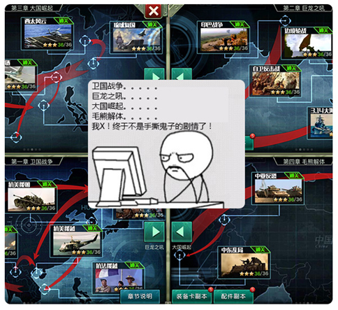 必须有军迷的情怀!!!但不意淫!因此,在做这款产品时,就已经翻阅各种历史资料,把那年那兔来回看了七七四十九遍,把共和国自卫反击战看了足足有九九八十一遍。这才设计出了结合近现代历史真实战争和史实的主线副本!! 游戏分为5个章节。既有建国后的卫国战争篇章,也就近代的军事格局篇章,也有对未来的世界格局的展望篇章,真正的不淫想。真正的为军迷,历史迷,时政迷设计。下图是简单截图游戏里的世界观和游戏章节,希望对历史迷和军事迷,有个直观的感受!