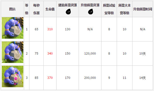 巨石投手,10本解锁,目前开放3个等级,10本可升至2级,11本可升至3级,详细数据如下。