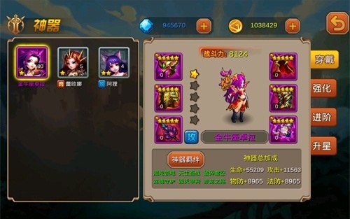 同时,当英雄装备上特定神器后,还会开启一个特殊属性,那就是“神器羁绊”。所谓羁绊其实很简单就是英雄的隐藏属性,游戏里每个英雄穿上特定星级以上的特定神器时,会激活羁绊效果,点击“神器”界面下方的“神器羁绊”按钮,可查看该英雄的神器羁绊,已激活的为亮,未激活的为暗。