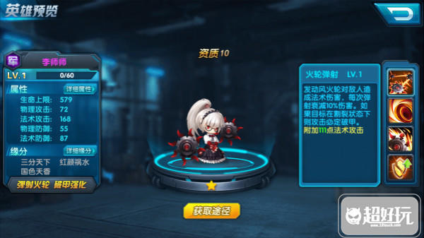 李师师可是个美人痞子,继承了α基因之后由于承受不住基因反噬,头发花白。扔挡不住她的美貌。 英雄——李师师 李师师:初始状态紫将。 定位:远程法师 获取途径:碎片商店,英雄召唤池,精英1-1,精英2-4,精英5-4. 初始状态: 生命上限:579 物理攻击:72 法术攻击:168 物理防御:55 法术防御:87 主动技能: ★火轮弹射 发动风火轮对敌人造成法术伤害,每次弹射缩减10%伤害,如果目标在割裂状态下则攻击必定破甲。 被动技能: ★技能一:急速旋转 挥出火轮对敌人造成法术伤害。 ★技能二:火焰轮 火焰轮对敌人造成法术伤害,兵是敌人灼伤。 ★技能三:破甲强化 打磨风火轮的齿轮,提高风火轮的破甲。 缘分系统: 李师师与武将妲己即可触发“红颜祸水”效果 提升法攻4% 李师师与武将孙权即可触发“三分天下”效果 提升生命值4% 李师师与武将虞姬即可触发“国色天香”效果 提升法攻4%