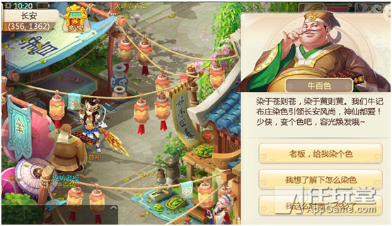 本次曝出的《大话西游手游》染色系统,将最大程度满足玩家,在角色个性彰显上的需求。独特的角色染色设定,灵活的颜色搭配方式,将在全新《大话西游手游》世界当中,留下玩家独一无二的大话记忆。 染色所需要的浣彩露、七色花以及染色粉等游戏道具,都可通过完成寻芳任务获得(也可通过多宝商城购买或商会交易获取)。累积到一定数量的染色道具,与长安城内染坊老板对话,即可进行角色染色操作。