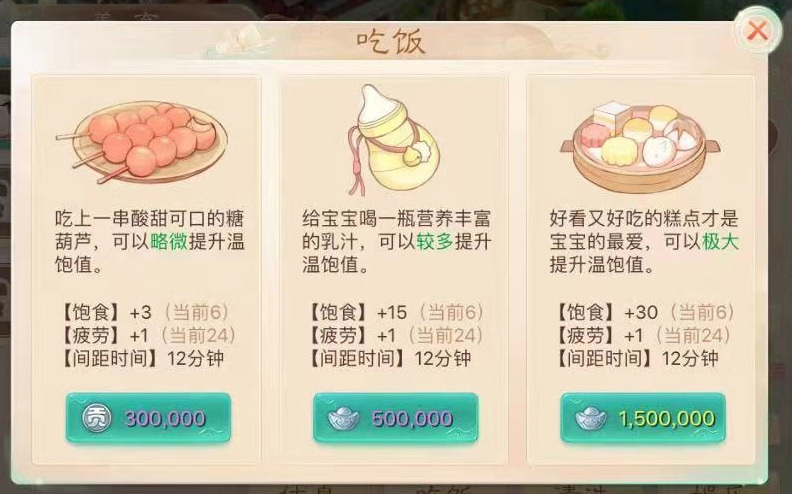 未满6岁的萌娃将会有气质、耐力、智力、内力四项属性,这些属性将会影响孩子成年之后解锁的结局。孩子每长大2个月,其中一项属性都会得到12点的提升。少侠们可以通过开启“休息”、“吃饭”、“清洗”、“娱乐”的方式提高健康度进行培养。让孩子的健康度保持在60以上,这样才能保证孩子可以最快的成长。
