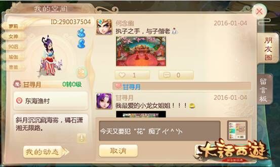 英俊爽朗的外形,清新亮丽的整体风格,交友主题海报一经推出,便吸引到了众多玩家的关注与热捧!海报中的“小鲜肉”刘昊然,不仅大方展示自己的专属个性标签,邀玩家标签匹配交友,搞怪逗趣的海报内容,也让玩家对于游戏新资料片当中的众多互动内容相当期待。 社交体验全面升级 大话朋友圈即将开放 作为1月新资料片中的重要玩法更新,游戏在近日首度开启“决战长安”全新玩法,邀玩家一道跨服PK!不仅如此,为配合游戏新资料片中全新上线的标签功能,近日,《大话西游》手游还将为所有玩家新增标签智能匹配(分为“同城玩家推荐”和“同兴趣玩家推荐”两部分)以及全新朋友圈功能,与玩家一道体验互动全面升级的大话交友乐趣!