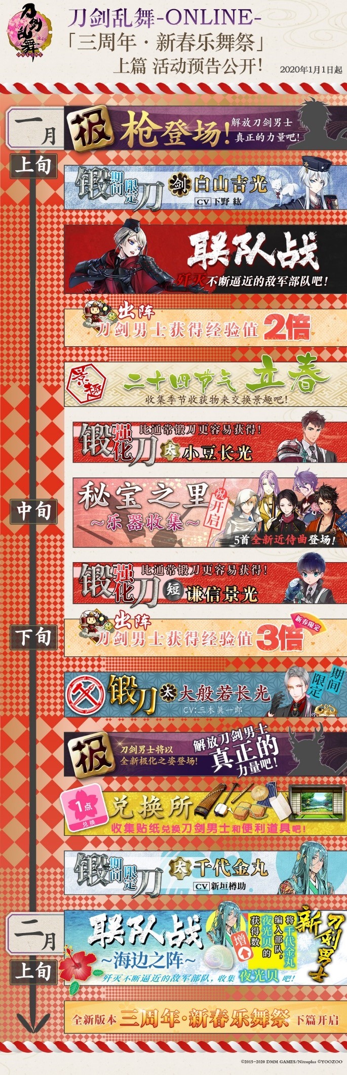 感谢各位审神者对《刀剑乱舞-ONLINE-》中文版的支持。随着新春佳节临近,《刀剑乱舞-ONLINE-》中文版2020年1月活动即将盛大开启。