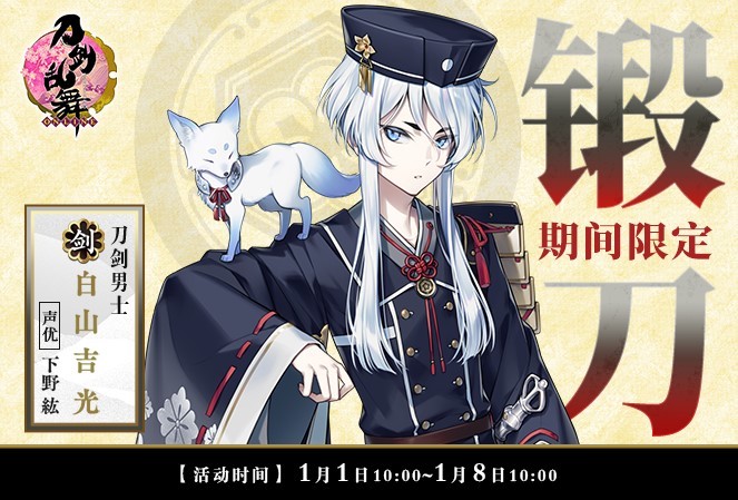 备受期待的人气刀剑男士「剑·白山吉光」限时登场。活动期间,审神者有机会通过锻刀功能获得「剑·白山吉光」。